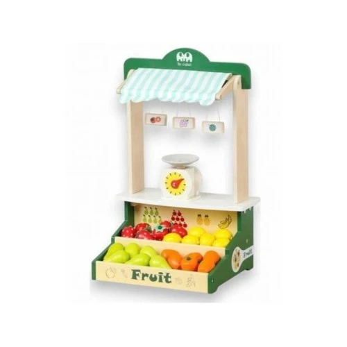 | Karakteristike | Realističan dizajn prodavnice prehrambenih proizvoda: sa šarenim tendama, reklamnim natpisom, simulacijom tržišnog obima i bogatom hranom za igru, tezga na pijaci voća farmera pruža impresivno i realistično iskustvo gde se deca pretvaraju da su prodavci ili kupci i igraju uloge sa prijateljima kako bi poboljšali svoje društvene veštine. Štand za dečiju pijacu ima 24 komada voća i nešto dodataka, uključujući 6 krušaka, 6 limuna, 6 jagoda, 6 persimona, 3 voćne karte i tržišnu vagu. |