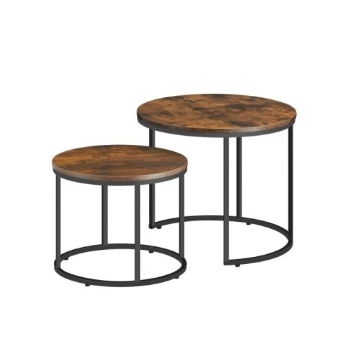 | Karakteristike | Boja: rustikalna i crna • Materijal: iverica (ploča) + čelik • Dimenzije većeg stočića: 53 x 45 cm (prečnik x visina) • Dimenzije manjeg stočića: 43 x 35 cm (prečnik x visina) • Ukupna težina proizvoda: 6,8 kg • Montaža: Proizvod se isporučuje za samostalno sastavljanje Napomena: Iz bezbednosnih razloga, deca ne bi smela da se penju na stočiće niti da se igraju s proizvodom. Manji stočić može se uvući ispod većeg, čime se štedi prostor u dnevnoj sobi.