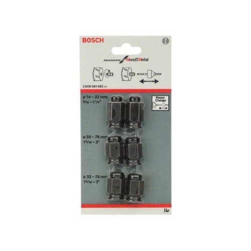 6-delni set prelaznih adaptera za standardne testere za otvore konkurentnog proizvođača (npr. Starrett, Baco, Lenox itd.) sa 2 adaptera za Ø 14-30mm (1/2"-20UNF navoj), 4 adaptera za Ø 32-210mm (5/8"-18UNF navoj)