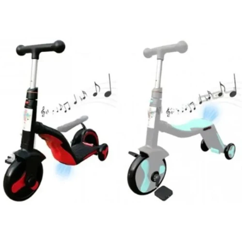 | Karakteristike | Poseduje pregradu za pedale i pribor za montiranje - uvek pri ruci 1. trotinet - bez pedala 2. tricikl - sa pedalama 3. guralica - bez pedala Gumena, neklizajuća drška podesiva po visini 3 nivoa podešavanja visine Svetlosni i zvučni efekti Koristi 2x AAA baterije (ne dobijaju se) Silikonski točkovi: Prednji točak veći, zadnja dva manja Mogćnost podešavanja međuosovinskog rastojanja točkova Poseduje kočnicu Moderan Izdržljiv Stabilan |