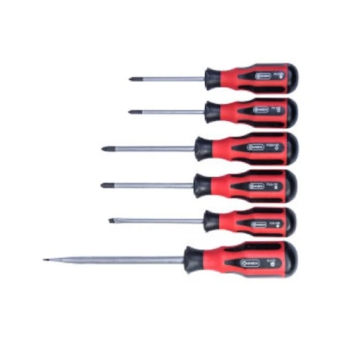 | Ostalo | Set šlic odvijača marke Conmetall od 6 komada. Odvijači su napravljeni od izuzetno kvalitetnog hrom-vanadijum čelika, i sadrže dvokomponentne ručke ergonomskog oblika u crveno-crnoj boji. Vrhovi su maksimalno izdržljivi i precizno i tačno se uklapaju. U pakovanju se nalaze 6 odvijača, dimenzije: 1x5,5x100mm, 1x8,0x150mm, 1xPH 1, 1xPH 2, 1xPZ 1, 1xPZ 2. |