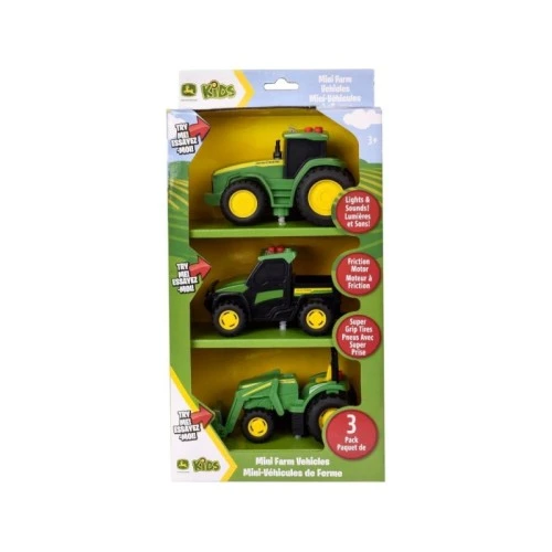 | Karakteristike | Minijaturne verzije kultnih vozila John Deere, uključujući traktor serije 7R, traktor 6105M i Gator. Pritisnite jedno od tri dugmeta i gledajte kako se jarka svetla pale dok zvuci donose vašem mališanu zabavu i maštu. Svako vozilo je spremno za pokret. Samo povucite, otpustite i gledajte kako ide! Deca će voleti da zamišljaju sebe za volanom dok se kreću kroz izmišljena polja sa ovim triom traktora i kamiona. Napravljen od vrhunskih, kvalitetnih materijala kako bi izdržao sate aktivne igre. |