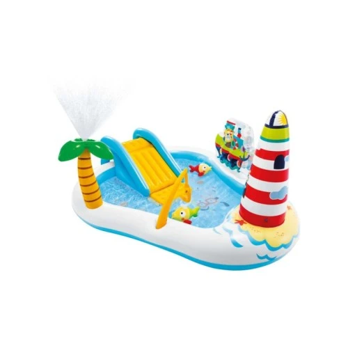 | Karakteristike | Oblik: Pravougaoni Kapacitet: 182 l Karakteristike: Uzrast: 2+ Maksimalno opterećenje: do 81 kg Kapacitet bazena: 182 l Dodatna oprema: Tobogan sa jastučetom u podnožju Štap za pecanje i dve ribice na naduvavanje Palmino drvo na koje može da se poveže baštensko crevo i izbacuje vodu kao prskalice i vodopad (protok vode na prskalicama i vodopadu se može regulisati na ventilu kojim rukuje odrasla osoba) 6 x loptica za igru različitih boja Set za krpljenje Dimenzije: 218 x 188 x 99 cm Materijal: PVC Boja: Višebojna |