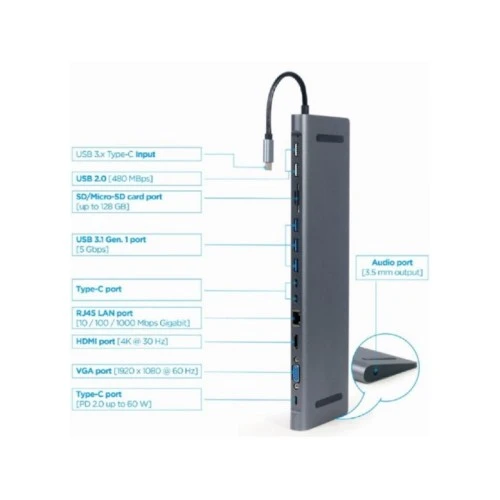 | USB port | Interfejs: USB-C Izlazni konektori: -USB 3.1 Gen 1 (5 Gbps) HUB sa 3 porta -USB 2 (480 Mbps) HUB sa 2 porta -HDMI port sa podrškom za UHD 4K @ 30 Hz -VGA Full HD video port -3.5 mm stereo audio izlaz -10/100/1000 Mbps Gigabit LAN port -Čitač SD i Micro-SD kartica -60 W USB Tipe-C Power Delivery 3.0 port |