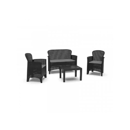 | Karakteristike | set čine: 2 fotelje, sto, dvosed set sa jastucima materijal: plastika Boja jastuka: siva Dimenzija fotelje: 59x57x85,5cm Dimenzija stola: 59x46x40cm dimenzije sofe: 113x57x85,5cm |