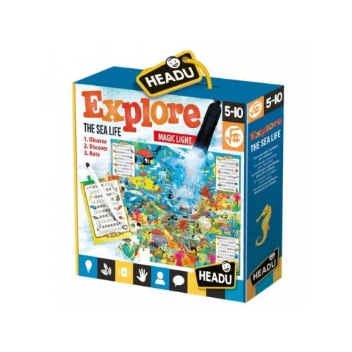 | Karakteristike | Pažljivo posmatrajte ilustracije i istražite sva bogatstva morskog sveta! Takodje, zahvaljujući pomoćnoj lampici, pronadjite i ono što sopstvenim okom niste primetili da postoji.. Dimenzije seta: 28,5 x 25,5 x 6,1 cm. |