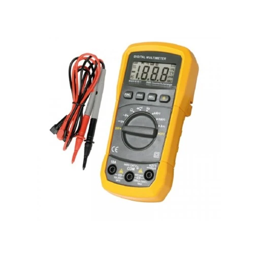 | Karakteristike | Napajanje 9V DC (6F22) Jednosmerni napon 200 mV / 2 V / 20 V / 200 V / 600 V Naizmenični napon 2 V / 20 V / 200 V / 600 V Jednosmerna struja 200 µA / 2 mA / 20 mA / 200 mA / 10 A Naizmenična struja 200 µA / 2 mA / 20 mA / 200 mA / 10 A Otpor 200 Ohm / 2 kOhm / 20 kOhm / 200 kOhm / 2 MOhm / 20 MOhm Frekvencija 20 kHz Bezkontaktno ispitivanje faze Ne Ispitivanje diode Da Ispitivanje prekida Da Automatska promena mernog opsega Da Pamćenje maks. vrednosti Da Fiksiranje vrednosti Da Automatsko isključenje Da Pozadinsko osvetljenje Da Kategorija merenja CAT III 600 V Dimenzije 140x67x30 mm |