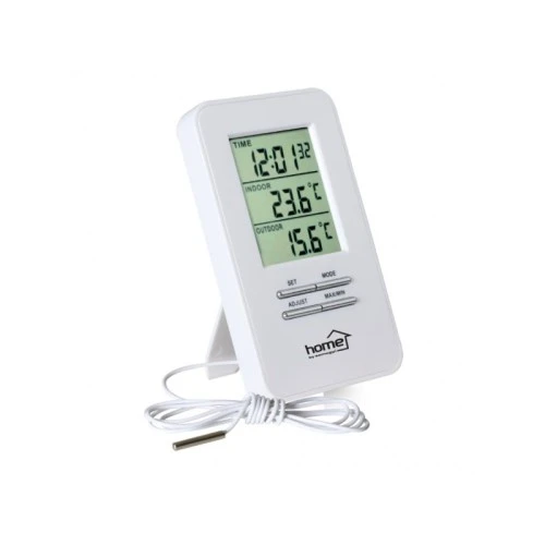 | Karakteristike | Napajanje: 2 x 1.5 V AAA baterije (nisu u sklopu) Montaža: Stona, zidna Merni opseg: Unutrašnji senzor: od -9°C do +50°C; spoljašnji senzor: od -20°C do +70°C Ekran: 41x53 mm Funkcije: Prikaz maks./min. izmerene vrednosti |