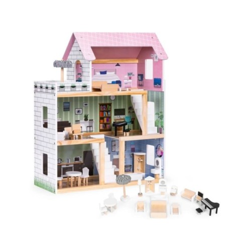 ECO TOYS Drvena kućica za lutke sa setom od 15 komada nameštaja