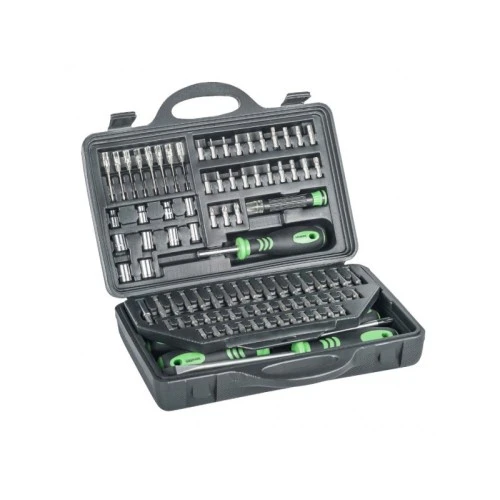 | Ostalo | Ključevi Nasadni ključevi 1/2", magnetna ručka za nastavke, precizna ručka za nastavke, nastavak za 1/2" nastavke, nastavak za nasadne ključeve Odvijači Pljosnati 5x75, 6x100, 8x150; Phillips 1x75, 2x100, 3x150 Nastavci za odvijač 25 mm (50 kom.), 50 mm (16 kom.), precizni nastavci (8 kom.) Pljosnati 25 mm: 3 / 2x4 / 4.5 / 2x5 / 5.5 / 2x6 / 6.5 / 7; 50 mm: 3 / 4 / 5 / 6; precizni: PH0000 / PH000 / PH00 / PH0 Phillips 25 mm: 2xPH0 / 2xPH1 / 2xPH2 / 2xPH3; 50 mm: PH0 / PH1 / PH2 / PH3; precizni: 1.2 / 2 / 2.5 / 3 Inbus 1.5 / 2 / 2.5 / 3 / 3.5 / 4 / 4.5 / 5 / 5.5 / 6 Torx 25 mm: T8 / T9 / T10 / T15 / T20 / T25 / T27 / T30 / T35 / T40; 50 mm: T10 / T15 / T20 / T25 Četvorougaoni S0 / S1 / S2 / S3 Pozidrive 25 mm: PZ0 / PZ1 / 2xPZ2 / 2xPZ3; 50 mm: PZ0 / PZ1 / PZ2 / PZ3 Dimenzije 315x85x245 mm (kofer) |