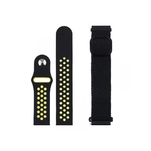 | Karakteristike | U setu se nalaze 2 narukvice. Odgovaraju Samsung, Amazfit, Huawei, Honor i ostalim pametnim satovima. Jedna silikonska rupičasta narukvica u crno zelenoj boji a druga tekstilna narukvica crna. Boja: Crna |