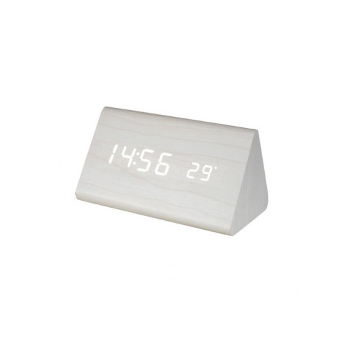 | Karakteristike | Napajanje: 5V DC / 1.2 A maks. (preko adaptera koji je u sklopu) ili 3 x 1.5 V AAA baterije (nisu u sklopu), 1 x CR2032 baterija (za čuvanje memorije) Montaža: Stona Ekran: Sedmocifreni LED, 120x22 mm, bele boje Merenje temperature: 0°-50°C Dodatne funkcije: Aktivacija displeja tapšanjem ili lupkanjem površine pored sata, ručna ili automatska kontrola osvetljenosti, 3 vremena buđenja, ispis temperature, ispis 12/24, isključivanje displeja Radio: Ne |