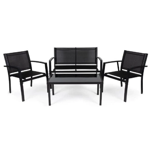 | Karakteristike | Set sadrži: 2 stolice i dvosed, sto sa staklom Dimenzije stolice: 60 x 63 x 77.5 cm Dimenzije klupe: 107 x 63 x 77.5 cm Dimenzije stola: 50 x 90 x 41 cm Okvir nameštaja: Metal Presvlaka: Tekstilin Težina seta: 25 kg |