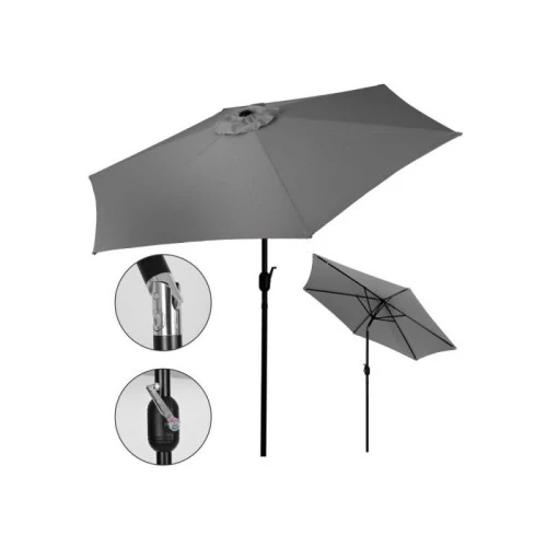 | Karakteristike | Materijal krošnje: Poliester 160 g/m² Okvir: Crni čelični okvir sa praškastim premazom Prečnik krošnje: 270 cm Visina: 240 cm Prečnik stuba: 38 mm Broj krakova: 6 Težina: 5.5 kg Boja krošnje: Siva Dodatne funkcionalnosti: Ventilacioni otvor na vrhu krošnje, Mehanizam za otvaranje sa kurblom Pakovanje: Specijalno ojačani karton |
