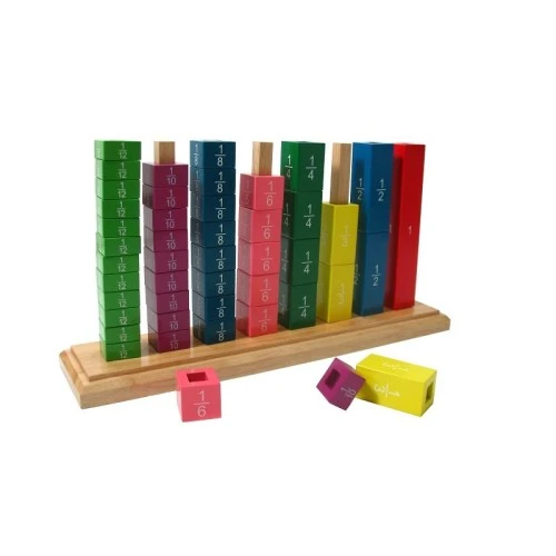 U setu se nalaze drveni kvadri, različitih boja, obeleženi brojevima u vidu razlomaka, sa procentima i grafičkim prikazom deljenja jednog celog na delove.