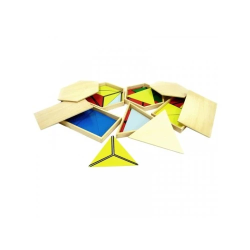 Set sadrži 2 pravougaone drvene kutije, 1 kutiju u obliku trougla i dve šestougaone kutije, a u svakoj od njih se nalaze trouglovi različitih vrsta, veličina i boja.