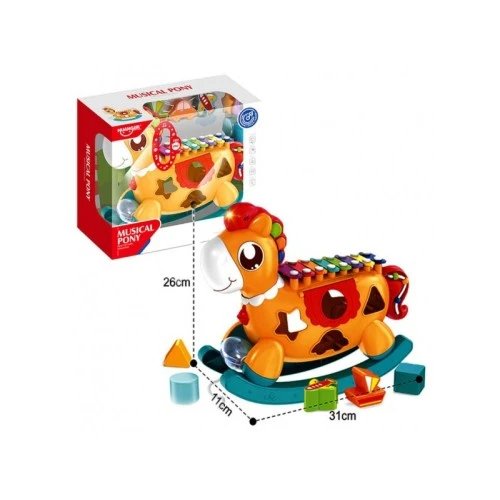 | Karakteristike | Interaktivni muzički konjić je sadži 7 umetaljki različitih geometrijskih oblika u crvenoj, plavoj, zelenoj, žutoj i ljubičastoj boji, kao i ksilofon sa udaraljkom. Dok se igra sa muzičkim konjićem, vaš mališan razvija finu motoriku, koordinaciju oko-ruka, prepoznaje oblike i zvuke, pospešuje muzikalnost i spretnost. Dimenzije kutije: 33.3*12.2*29cm, dimenzije proizvoda: 31*11*26cm Uzrast: 18+ meseci |