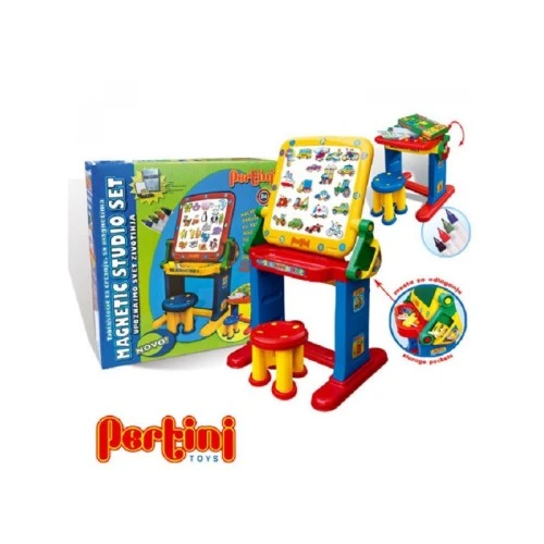 | Karakteristike | Pertini Magnetic studio-saobraćaj razvija kreativnost, opažanje, organizacione sposobnosti i edukuje decu na temu saobraćaja. Po tabli se piše flomasterima koji se lako brišu. Set sadrži tablu za crtanje / stočić, magnete saobracaj -20kom,stoličicu, flomaster, sunđer. * Dimenzije: 50x50cm, h=98cm. * |