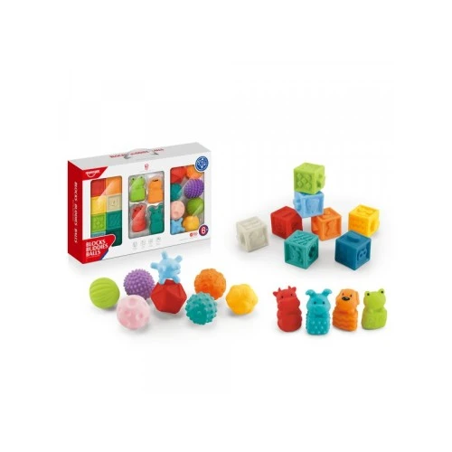 | Karakteristike | Set koji sadrži 20 edukativnih i mekanih igračaka. Igračke su napravljene od bezbednih materijala, sa zaobljenim ivicama, pogodne su za bebinu šaku i mogu služiti i kao glodalice. Različitih su boja i oblika, podstiču finu motoriku i aktiviraju bebina čula. Specifičan dizajn u vidu ispupčenih i udubljenih delova čini ove igračke posebno pogodnim za razvoj taktilnog čula deteta. |
