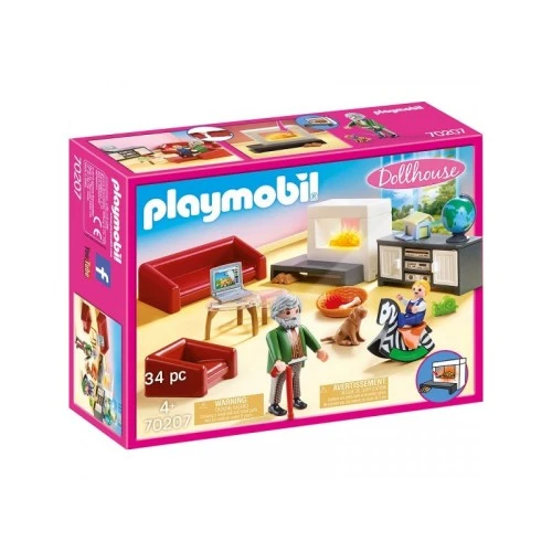 | Karakteristike | Figure: 1 deda, 1 dete. Životinje: 1 pseće štene. Pribor: 1 električni kamin, 1 ogrevno drvo, 1 kauč na razvlačenje, 1 stolica-krevet, 1 kredenac, 2 stola za dnevnu sobu, 1 štap za hodanje, 1 košara za pse, 1 povodnik za pse, 1 pseća kost, 1 laptop, 1 hi-fi sistem (3 dela), 1 globus, 1 maketa kućica, 1 konj ljuljaška, 1 igračka puž, 1 igračka jež. |