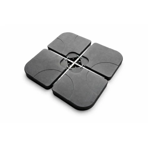 | Karakteristike | Materijal: HDPE (polietilen visoke gustine) Zapremina (po segmentu): 15 L Dimenzije (po segmentu): 50 × 50 × 7,5 cm Ukupno u setu: 4 kom 8 / 8,8 kg Težina kada je napunjeno: – vodom: 60 kg – peskom: 80 kg Uputstvo za upotrebu: Napuniti svaki segment vodom ili peskom. Preporuka: koristiti pesak za veću stabilnost. Isprazniti bazu tokom zime. |