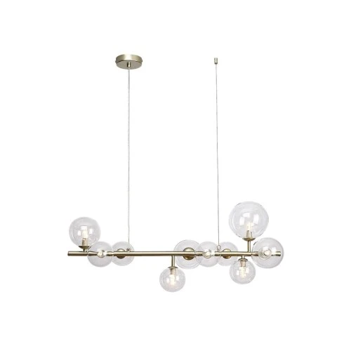 | Karakteristike | Tip: Visilica Stil lampe: Moderna Preporučena prostorija za korišćenje: Dnevna soba, trepezarija, spavaća soba IP zaštita: IP20 Boja lampe: Zlatna Materijal lampe: Metal Boja abažura: Transparentna Materijal abažura: Staklo Broj grla: 10 Vrsta grla: G9 Specifikacije osvetljenja: G9 10x max 28W Primenjena voltaža: 230V, 50Hz Rastojanje od plafona: 1200 mm Dužina: 800 mm Prečnik baze: 100 mm Klasa zaštite: II |