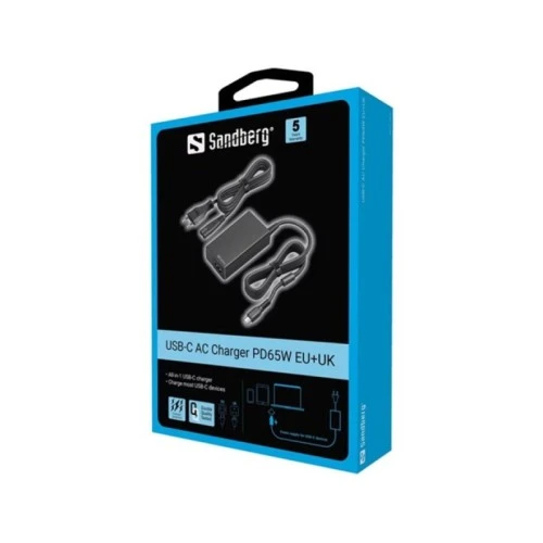 | Karakteristike | Cable length: 1.8 metres Rated input voltage (50-60 Hz): AC 100 V - AC 240 V Output: 5V/3A, 9V/3A,12V/3A, 15V/3A, 20V/3.25A (65W Max) Built-in overload protection Built-in short circuit protection Sandberg USB-C AC punjač PD65W je pametan i kompaktan USB-C PD punjač za brzo punjenje vaših USB-C uređaja kao što su pametni telefon, tablet i laptop. Sa performansama do 65W imaćete optimalnu brzinu punjenja za većinu svojih uređaja. Dolazi sa priključenim USB-C kablom, kao i uklonjivim kablom za napajanje za EU i UK utičnicu |