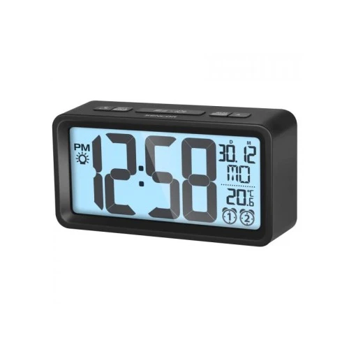 | Karakteristike | LCD ekran s kratkotrajnim belim pozadinskim osvetljenjem Funkcija noćnog svetla Digitalni prikaz vremena Format prikaza: 12 /24 sata Prikaz temperature: °C / °F Kalendar s danima u sedmici na 7 jezika Buđenje zvučnim signalom Dvostruki alarm Funkcija odlaganja alarma Raspon temperature: 0°C ~ +50°C Mogućnost upotrebe na radnom stolu Napajanje: 2 baterije AAA od 1,5 V Dimenzije: 129 x 67 x 40 mm Masa: 137 g |
