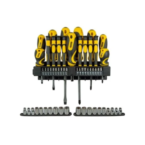 | Karakteristike | Sadrži: 8 odvijača: *Ravni: 6X38, 5X75, 6X100, 8X150mm *Zvezdasti: PH2X38, PH1X75, PH2X100, PH3X150mm *1 Izmenjivi Multibit odvijač 50 mm 8 preciznih odvijača: *Ravni: 2.0X50, 2.5X50, 3.0X50 *Zvezdasti: PH000X50,PH00X50, PH0X50. *Torx: T6X50, T8X50 19 nastavaka (1 inča/25mm): *Ravni: 4mm,4.5mm, 5.5mm, 6mm *Zvezdasti: PH0, PH1, PH2, PH2, PH3 *Hex: H2,H2.5,H3, H4, H5, H6 *Torx: T20,T25, T30, T40 1 Magnetni nastavak (1"/25mm) 20 Nasadnih ključeva 1/4"x20mm: 4mm,5mm,6mm,7mm,8mm,9mm,10mm,11mm,12mm,13mm 5/32, 3/16, 7/32, 1/4, 9/32, 5/16, 11/32, 3/8, 7/16, 1/2 1 Plastični zidni nosač sa potrebnim vijcima |