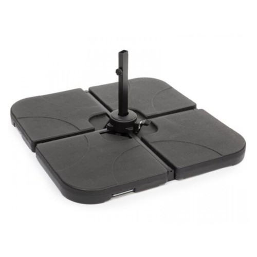| Karakteristike | Tip: Postolje za suncobran Broj delova u setu: 4 Dimenzije: 50cm x 50cm x 7.5cm (1 deo) Materijal: HDPE plastika Kapacitet 1 tega: 15l Težina: 60kg (sa vodom), 80kg (sa peskom) Za modele: FDZN 5103, FDZN 5105, FDZN 5107, Integrisane udubljene ručke Boja: Crna |
