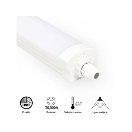 | Karakteristike | Nazivni napon:220-240 V AC Nazivna snaga:50 W Temperatura boje svetlosti: 4000 K Boja svetla NW: ( prirodno bela-neutralna ) Svetlosni fluks: 5000 lm Izvor svetlosti: LED SMD 2835 ( 0.2 W x 276 pcs ) Dimabilnost: Ne Materijal: PC Dimenzije: 1512 x 68 x 56 mm Način / Tip: Montaže nadgradna Ugao rasipanja svetlosti: 120° Indeks reprodukcije boje (CRI): ≥80(Ra) Faktor snage(Pf): 0.9 Temperatura okruženja: (ºC) -10 °C do +50 °C Prosečan radni vek: 30 000 h na 25° C Broj uključenja / isključenja: 15 000 Energetska efikasnost: A+ Stepen Električne Zaštite:Klasa II IP Zaštita: IP 65 Transportno pakovanje: 15 kom |