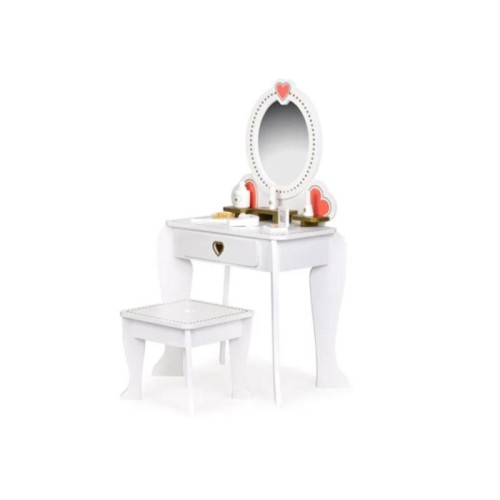 | Specifikacija | Veliki drveni sto za šminkanje za devojčice Dopustite vašoj devojčici da uživa u čarobnom svetu šminke i igre sa ovim prelepim drvenim stolom za šminkanje. Dimenzija 49x34x97cm, sa prostranom radnom površinom za igru. Komad nameštaja opremljen je ogledalom ukrašenim okvirom sa šarmantnim srcima i prostranim fijokama. U setu se takođe nalazi udobna stolica i dodaci poput malog ogledala, fen za kosu, četkica za zube, parfem i karmin. Proizvod brenda Ecotoys, potpuno bezbedan za decu. Dimenzije pakovanja: 44,5x22,5x50,5 cm, Težina: 8,5 kg |