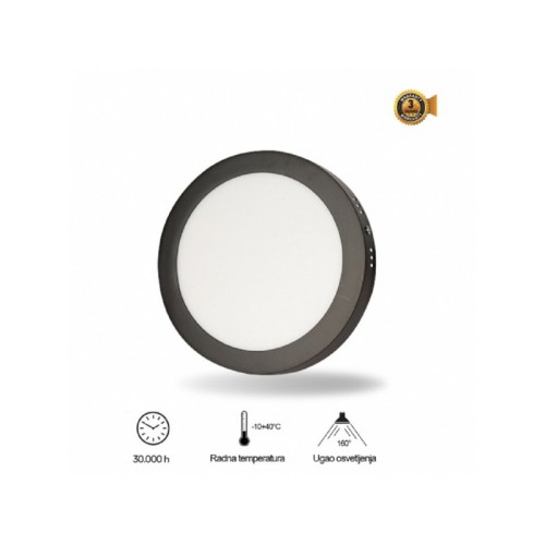 | Karakteristike | Nazivni napon: 85-265 V AC Nazivna snaga: 18 W Temperatura boje svetlosti: 4000 K Svetlosni fluks: 1800 lm Izvor svetlosti: LED Dimabilnost: Ne Materijal: Aluminijum/PS Difuzor: LGP PS Dimenzije: Ø 225 mm, h - 35 mm Tip montaže: Nadgradna Ugao rasipanja svetlosti: 160° Indeks reprodukcije boje (CRI): ≥80(Ra) Temperatura okruženja (ºC): -10 °C do +40 °C Prosečan radni vek: 30 000 h na 25° C Energetska efikasnost: A+ Stepen električne zaštite: Klasa II IP zaštita: IP 20 Potrošnja elek. energije:: 18 Kwh / 1000h |