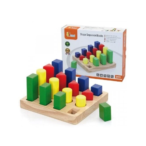 Pakovanje sadrži drveno postolje, 16 geometrijskih tela u 4 oblika, 4 boje i 4 visine.